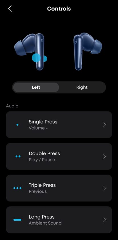 על מנת להפעיל את האוזניות אנקר ציידה את ה- Liberty 5 בכפתורי צביטה. היתרון של כפתורים כאלה הוא שלא תלחצו עליהם בטעות, אבל החיסרון הוא שהן פחות נוחות לתפעול. הדעות חלוקות לגביי מה עדיף, אבל בכל מקרה שמחתי לגלות שהן פועלות היטב, מאפשרות לשלוט על הכל וניתן להגדיר את כל מחוות הצביטה באפליקציה.
